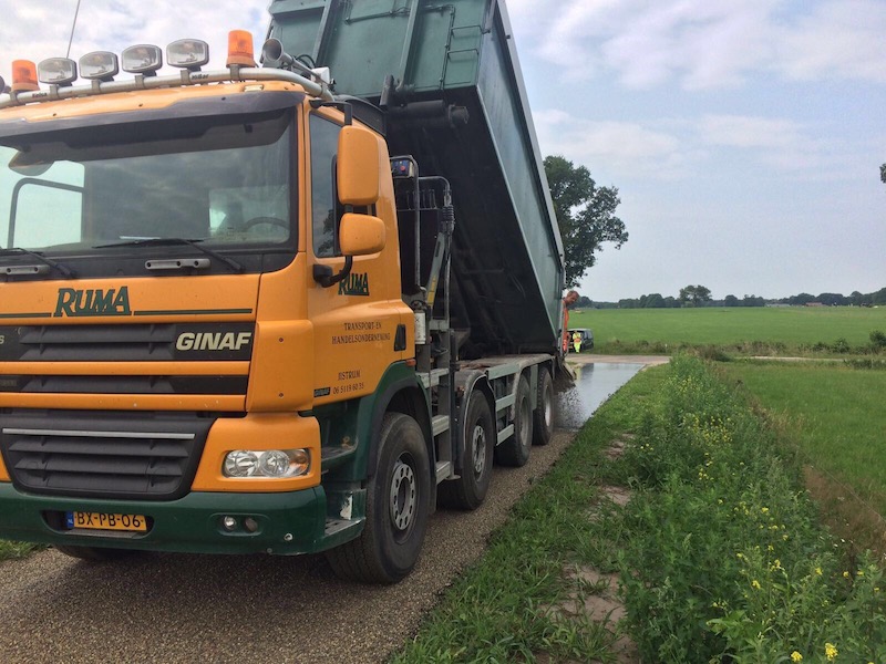 Afhankelijk van de opdracht wordt het warme asfalt vervoerd in speciaal geïsoleerde asfaltkippers of een hotbox kippervrachtauto. De hoge isolatiewaarden van deze kippers zorgen ervoor dat een perfecte verwerkingstemperatuur bij aflevering wordt gegarandeerd. RUMA weet dat alleen bij de juiste temperatuur asfalt goed kan worden verwerkt en uitgereden.