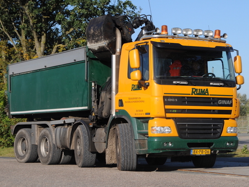 In het wagenpark van RUMA zijn meerdere type kipper vrachtwagens te vinden, zodat ieder transport op maat wordt afgestemd. Zo zijn er kippers die volledig zijn aangedreven, een meesturende achteras hebben en zeer geschikt zijn om op onverhard terrein te rijden. Maar ook achteras aangedreven kippers met wide spread, waardoor deze extra grote massa mag vervoeren.